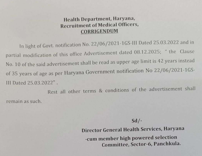 | Haryana Health MO Recruitment 2025 Age Corrigendum | Corrigendum |