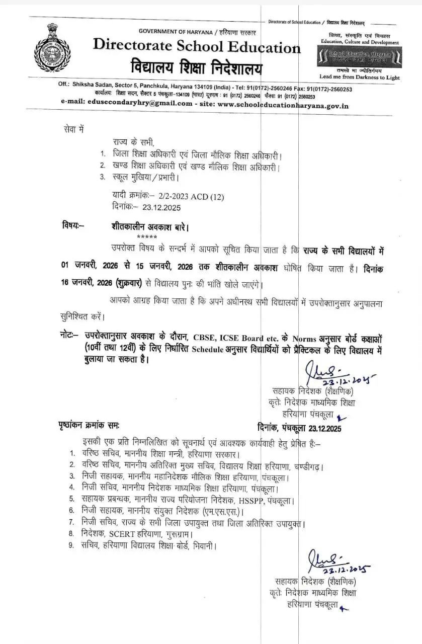यह आदेश 23 दिसंबर 2025 को जारी किया गया है और पूरे हरियाणा राज्य में प्रभावी रहेगा। शीतकालीन अवकाश की यह अवधि छात्रों और शिक्षकों दोनों के लिए राहत देने वाली मानी जा रही है, खासकर ठंड के मौसम को देखते हुए।