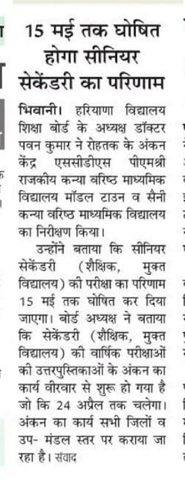 As per the newspaper update, Haryana Board Chairman Dr. Pawan Kumar has confirmed that the Senior Secondary (12th) result will be declared by 15 May 2026. This is a strong and reliable update coming directly from the board side, which means the result can come anytime in the second week of May 2026.
