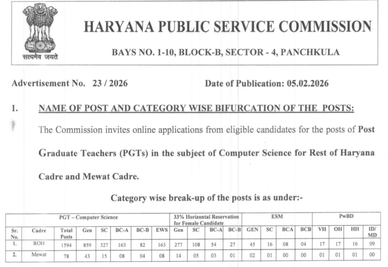 HPSC PGT Computer Science Recruitment 2026: Haryana Public Service Commission has released the Advt 23/2026 official notification for PGT Computer Science Recruitment 2026. Online applications are invited for the post of Post Graduate Teacher (PGT) – Computer Science for Rest of Haryana Cadre and Mewat Cadre. Eligible candidates can apply online through the HPSC official website within the given schedule.