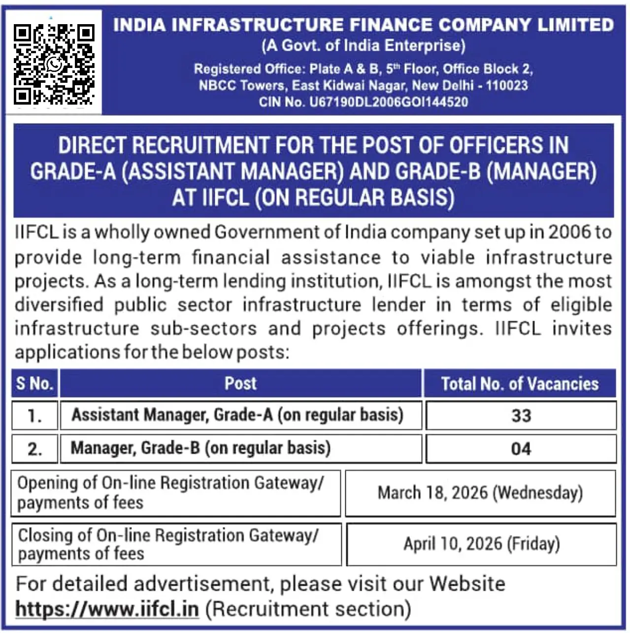 IIFCL Assistant Manager Recruitment 2026: India Infrastructure Finance Company Limited (IIFCL) has released a new recruitment notification for Officer posts in Grade A (Assistant Manager) and Grade B (Manager) on a regular basis. This is a strong opportunity for candidates looking for a stable and high-paying government job in the finance sector. IIFCL is a Government of India enterprise established in 2006 that provides long-term financial assistance to infrastructure projects across India. The IIFCL Assistant Manager Grade A Recruitment 2026 Notification has been released on 18 March 2026 and the online applications are invited from 18 March to 10 April 2026.