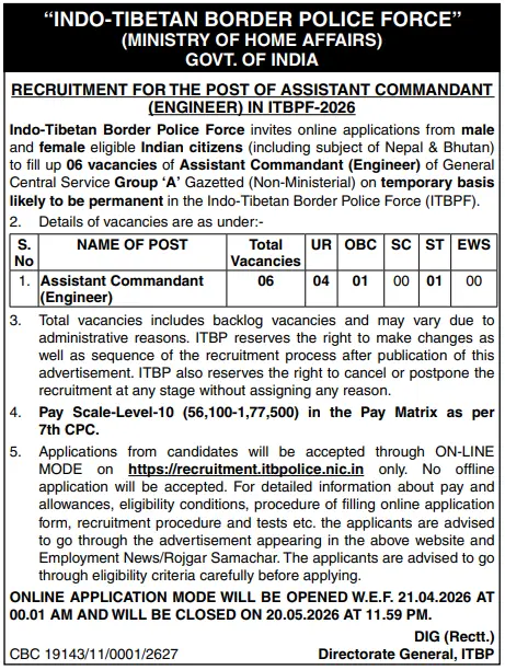 ITBP Assistant Commandant (Engineer) Recruitment 2026 Online Form (From 21.04.2026)Apply Online