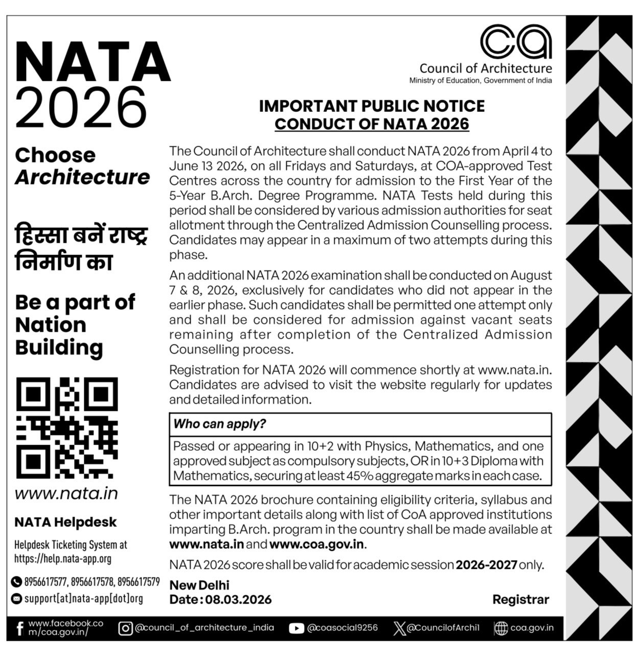 NATA 2026 Exam: The Council of Architecture (CoA), Ministry of Education, Government of India, has released an important public notice for NATA 2026 (National Aptitude Test in Architecture). This national level entrance examination is conducted every year for admission into the first year of the 5-Year Bachelor of Architecture (B.Arch) programme offered by architecture colleges across India. Students who want to build a career in architecture must qualify NATA 2026 Entrance Exam to secure admission through centralized counselling conducted by various admission authorities.